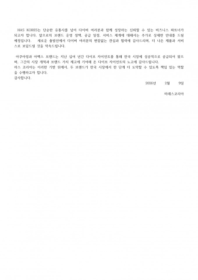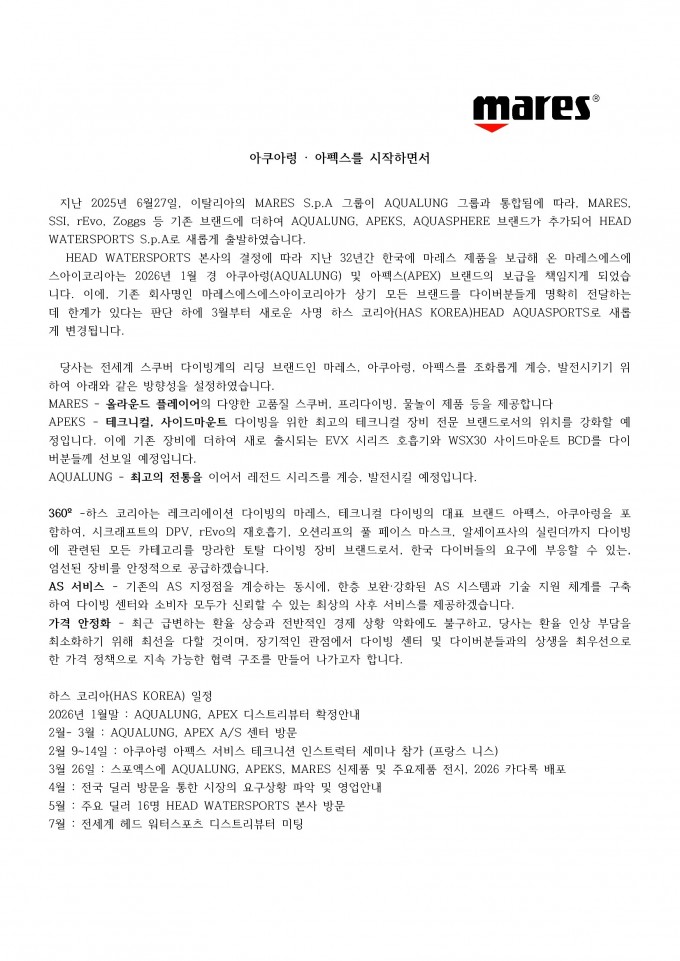 - 1) 아쿠아렁, 아펙스 및 아쿠아 스피어 브랜드 디스트 리뷰터 변경 안내